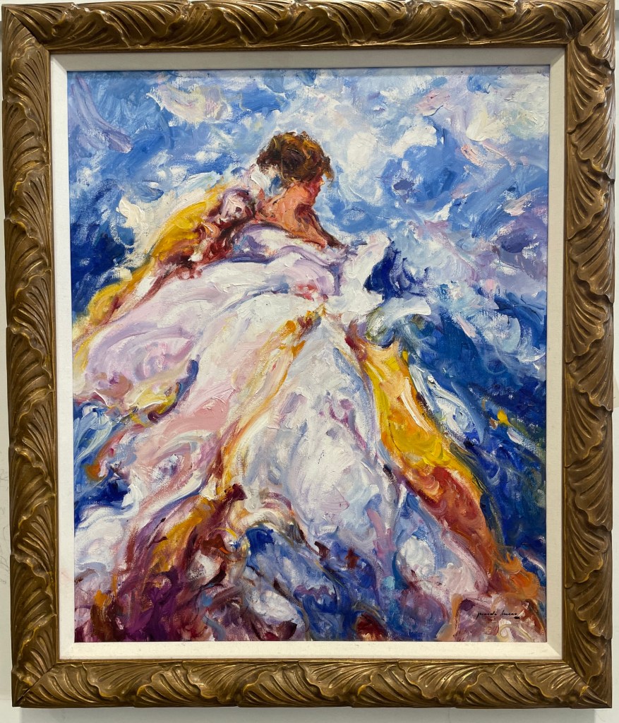 A swirl of color, motion, and memory—“El Viaje” captures the intimacy of two figures suspended in a dreamlike sky. Pineda Bueno’s brushwork dances between abstraction and emotion, evoking the feeling of a journey not just through space, but through connection.