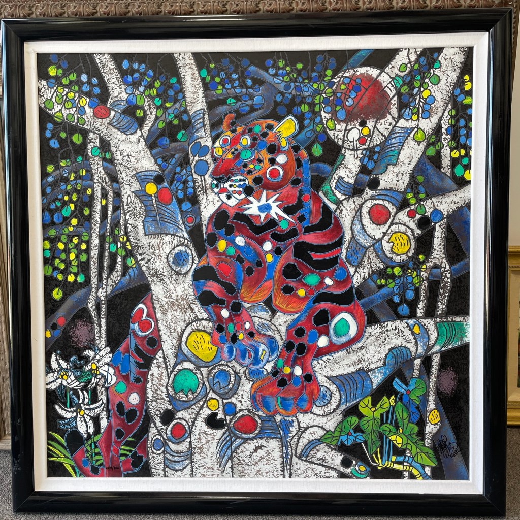 This 36β x 36β serigraph on canvas by world-renowned artist Jiang Tie Feng explodes with color and energy β a true statement piece for any collection.