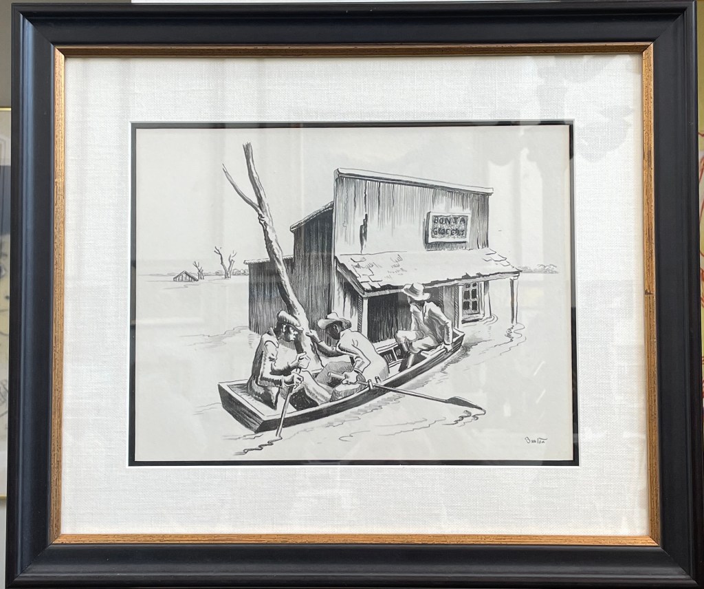 The scene—three figures paddling past “Bonya Grocers” in a submerged town—evokes resilience, irony, and quiet defiance. Benton’s hand is unmistakable in the muscular lines and cinematic composition.