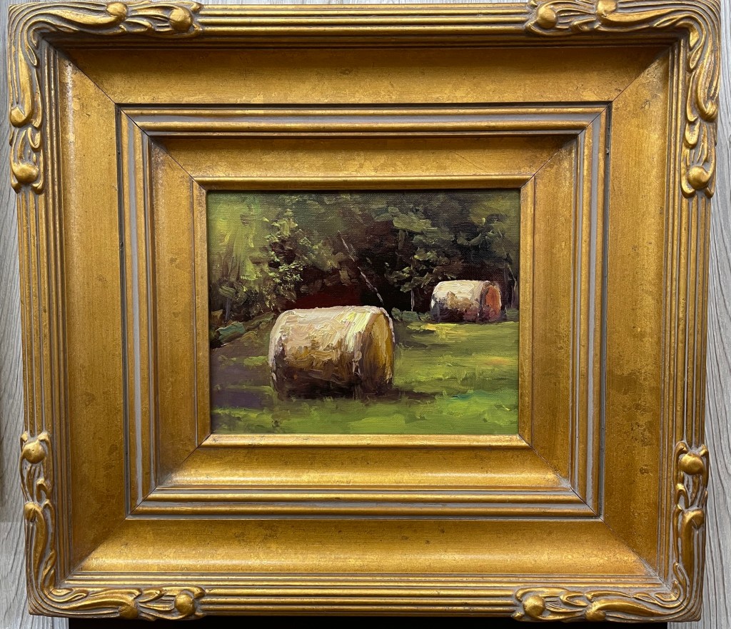 Golden light, freshly rolled hay, and the quiet rhythm of Iowa farmland—captured en plein air by regional artist Brian Parr. This intimate landscape invites you into a moment of stillness and harvest, framed in antique gold for timeless elegance.