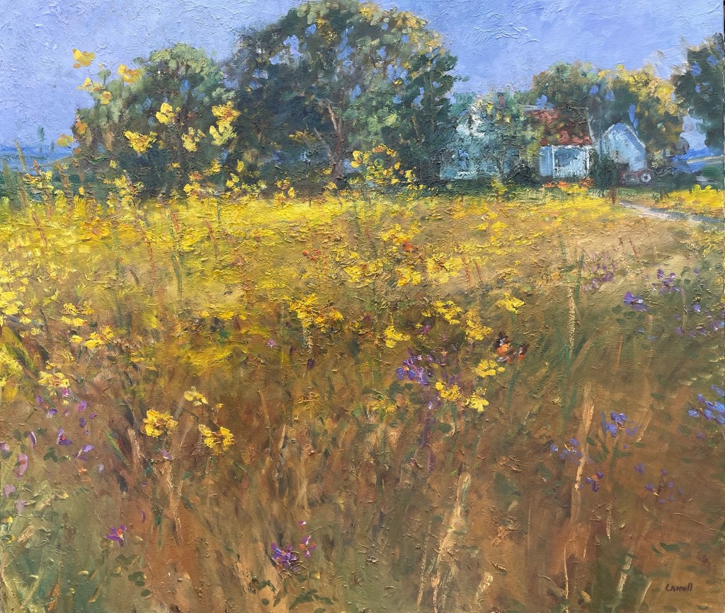 Golden blooms stretch across a quiet field, kissed by soft sky and framed by red-roofed cottages—John P. Carroll’s “Field of Yellow Wildflowers” captures the stillness and warmth of the Midwest in full bloom. This signed oil on canvas (29” x 33”) blends textured brushwork with timeless charm. A Kansas City original, ready to bring peace and prairie beauty to your space.