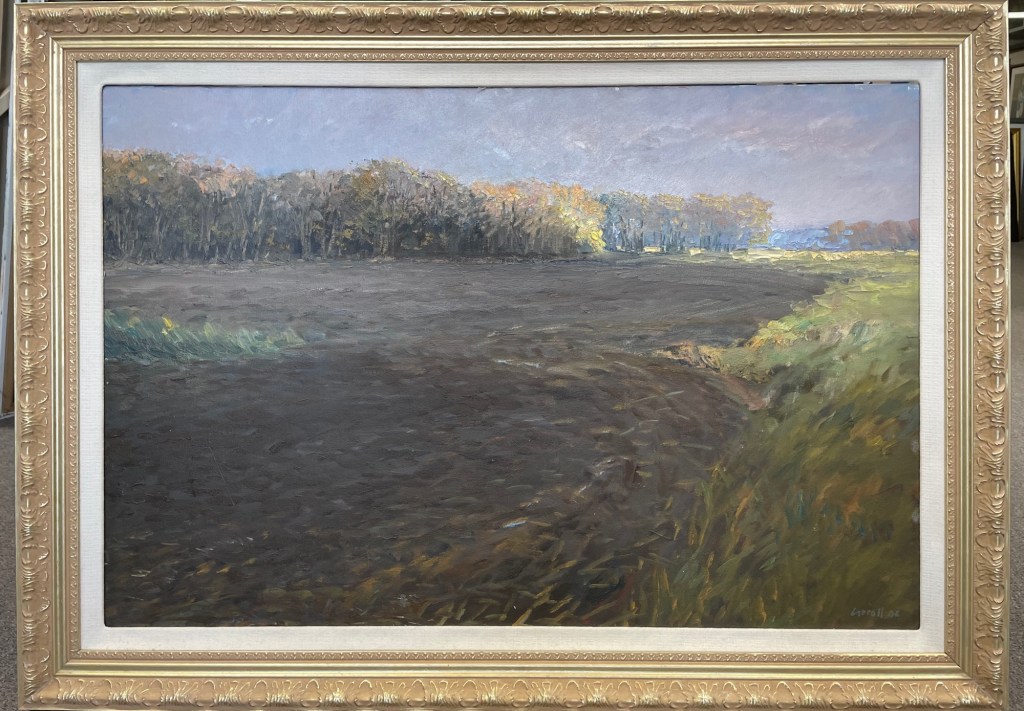 This original oil on canvas, “November Fields” by John Carroll, captures the expansive beauty of farmland resting under a cool sky, framed by trees touched with golden light. At 24” x 36”, it’s a statement piece that brings warmth and calm into any space.