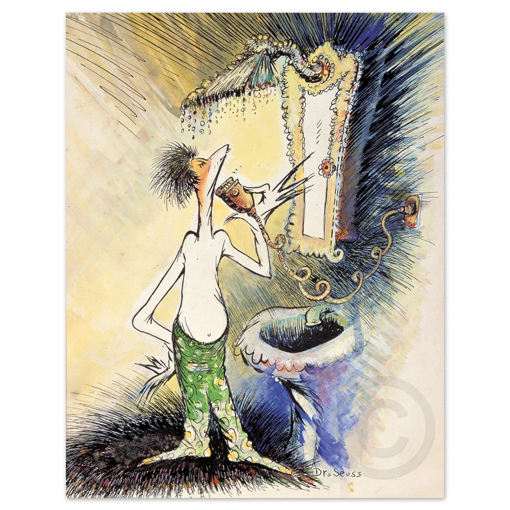 This is Dr. Seuss’s 1964 painting, Self-Portrait as a Young Man Shaving. Ted, who lived in a New York City apartment in the 1930s, portrays himself as a modern man who uses an electric shaver. Apparently, he also kept a “shaving file” filled with ideas and concepts that came to him while shaving. Photographs verify that his stance here at the sink mirrors his stance at the easel.