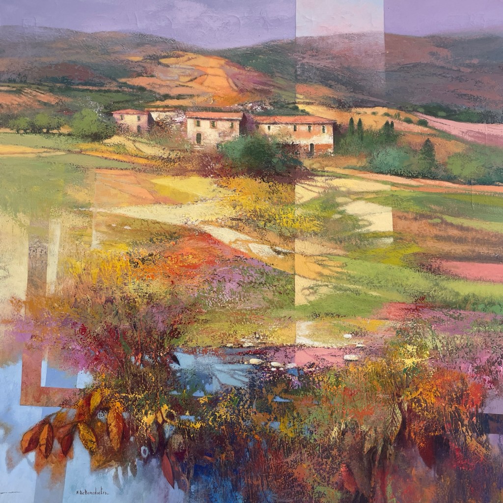 A quiet village glows beneath a violet sky, where rustic rooftops and reflective waters meet in a dreamlike dance. Nicola de Benedictus blends realism with abstraction, inviting you into a layered countryside that feels both timeless and alive. This evocative landscape captures the soul of a countryside retreat—red-tiled roofs nestled among rolling hills, water lilies drifting across a reflective pond, and brushwork that shifts with every glance.