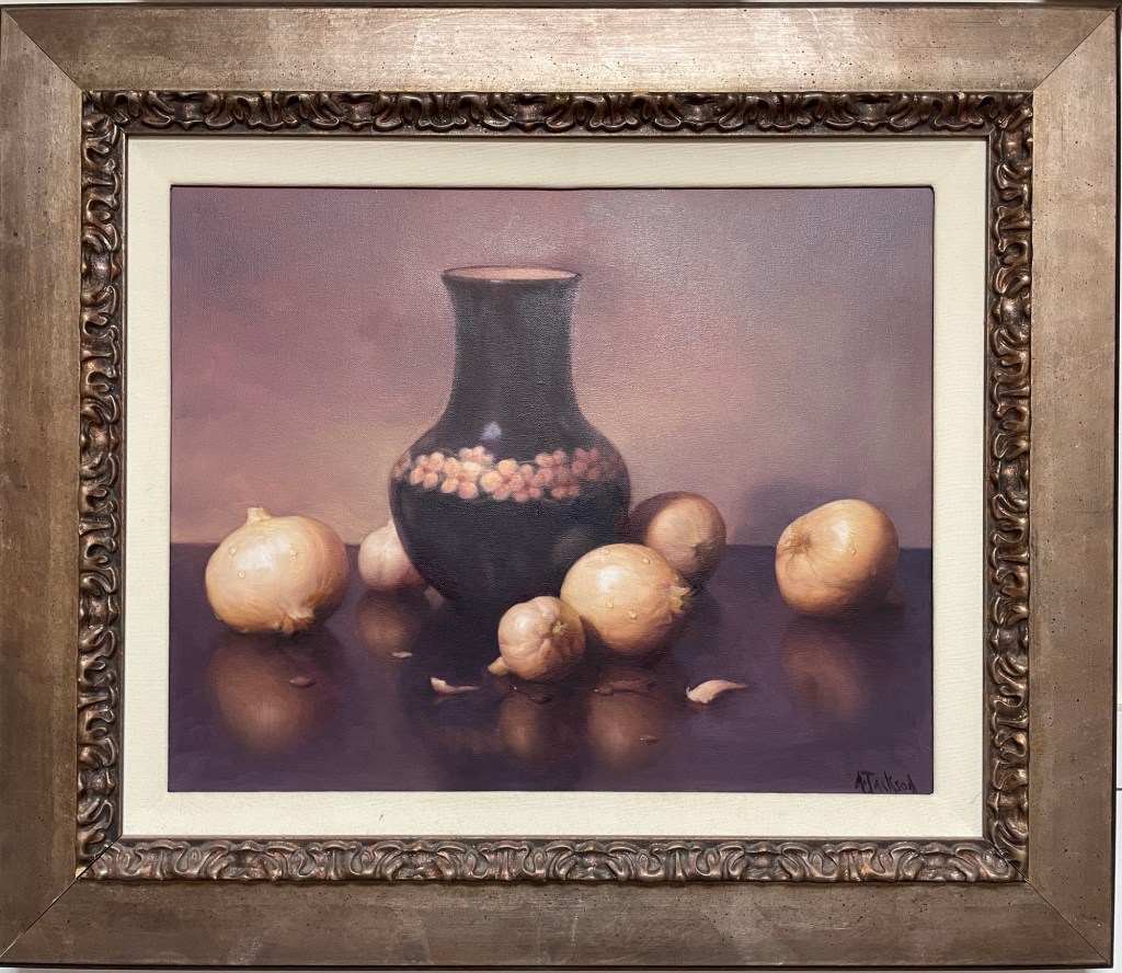 A study in patience and presence—onions half-peeled, a ceramic vase adorned with quiet ornament, all resting in soft shadow. Jackson’s brushwork invites you to linger in the ordinary, where light becomes memory and texture becomes time.