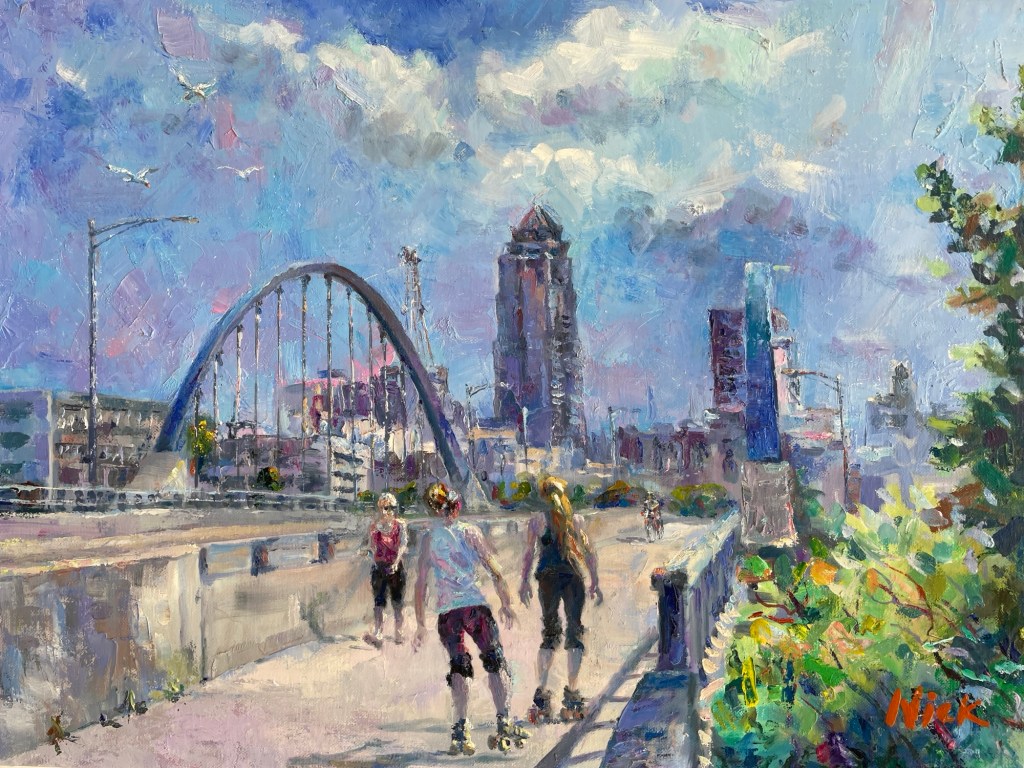 Des Moines pulses with motion in this vibrant cityscape—where skaters glide across the bridge, clouds swirl above the skyline, and nature leans in from the margins. Proykov captures not just a place, but a rhythm: the quiet rush of urban life, the joy of movement, the contrast between steel and bloom.