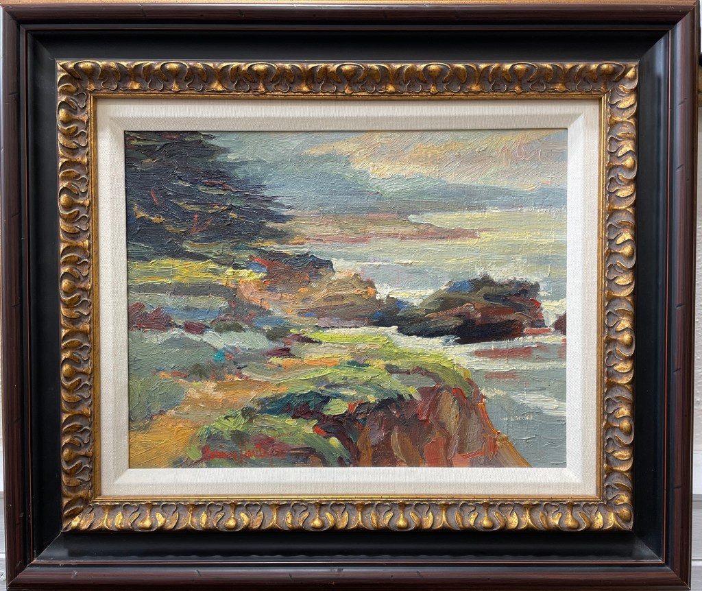 A windswept trail, a restless sea—Hartley’s brushwork dances between motion and stillness. This coastal vignette invites you to wander through texture and light, where the waves crash and the sky broods with quiet drama. A small canvas with expansive emotion.