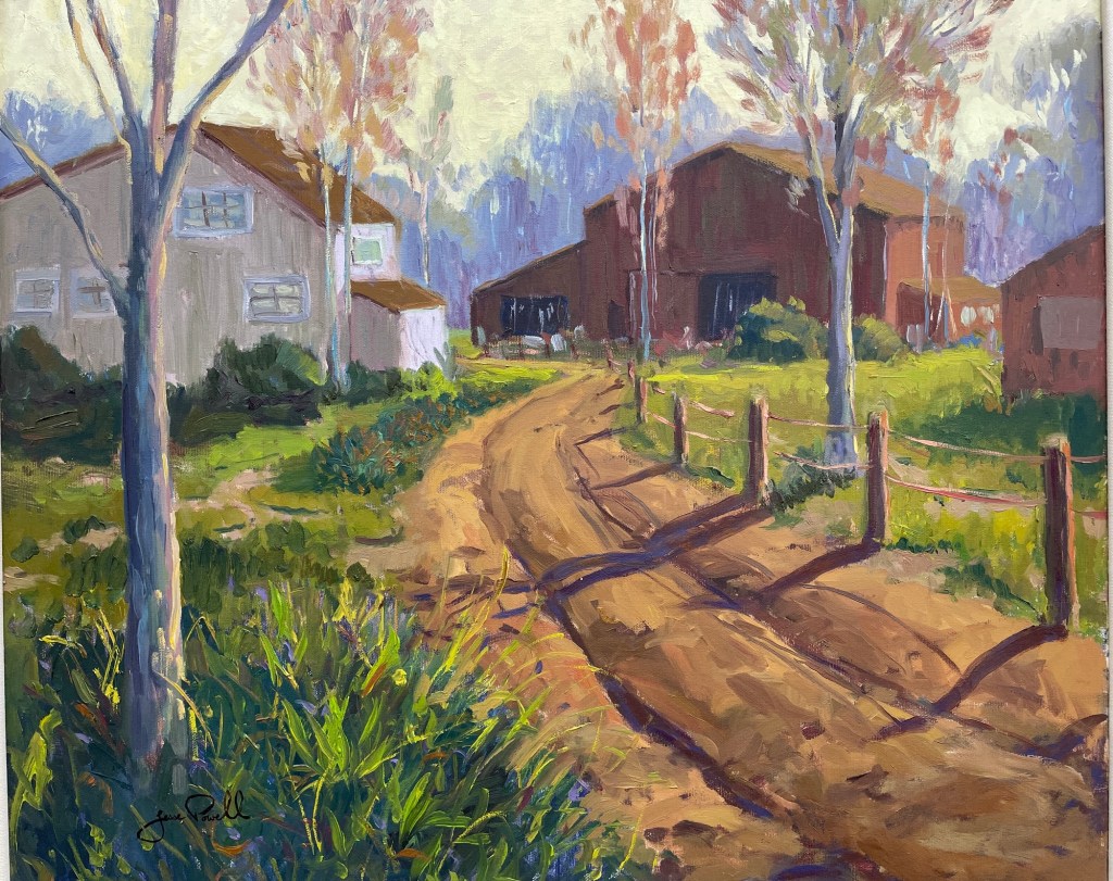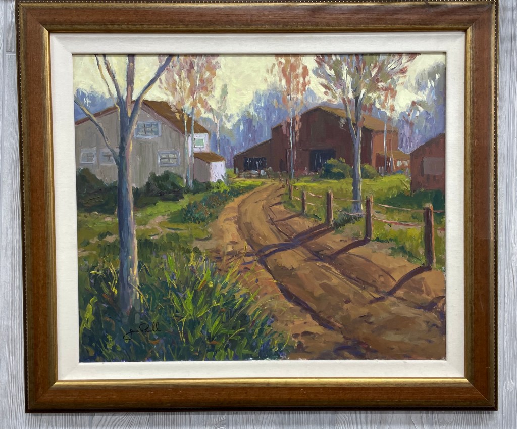 Powell beautifully captures the golden glow of late afternoon light, where warm shadows stretch across a country path and barns fade gently into the evening air. His brushwork and palette bring both serenity and movement to this timeless rural scene.