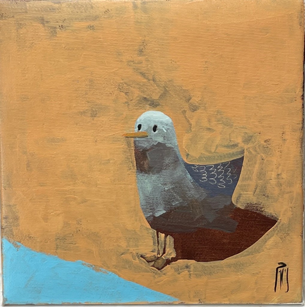 A whimsical study in shadow and simplicity, Rossia’s stylized bird evokes quiet resilience against a textured, sunlit terrain. The limited palette and minimalist form invite reflection—where solitude meets serenity.