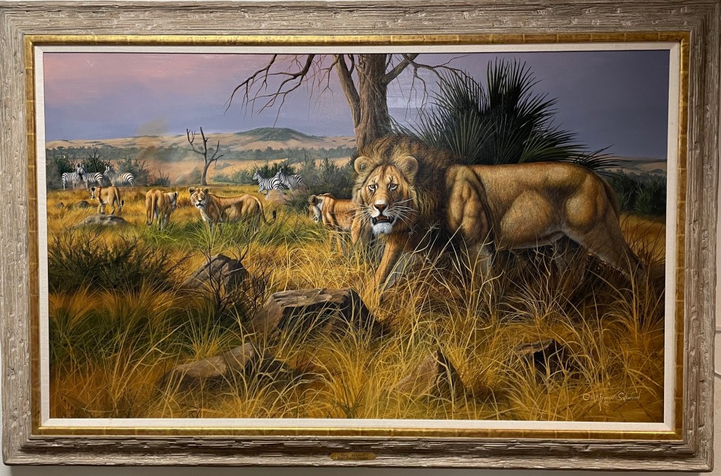 A moment suspended in silence. Swansonâs The Hunt captures the raw elegance of predator and prey in the African savannahâwhere instinct rules and beauty hides in the brush. The male lion stands poised, lionesses flank him in quiet coordination, and zebras graze unaware in the distance. Itâs natureâs choreography, rendered with masterful detail and reverence.