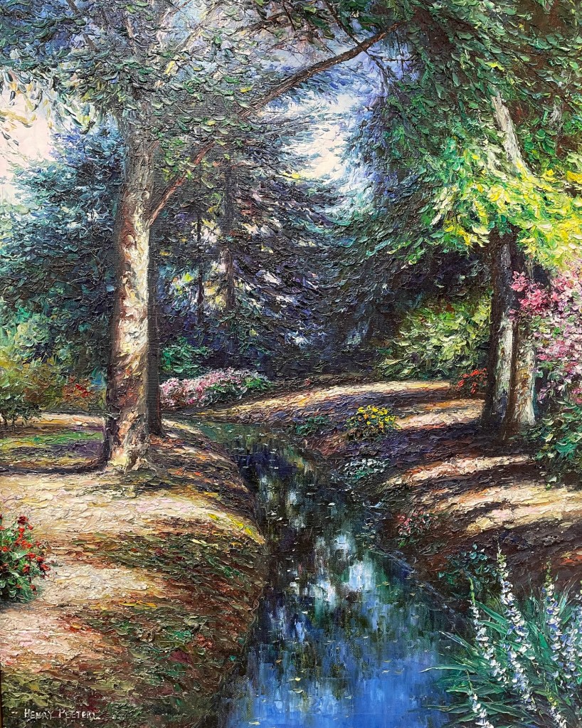 This stunning 30” x 20” original oil on canvas captures the peaceful beauty of a wooded creek bathed in dappled light. With rich textures and vibrant tones, Peeters brings nature to life in a way that feels both timeless and serene.