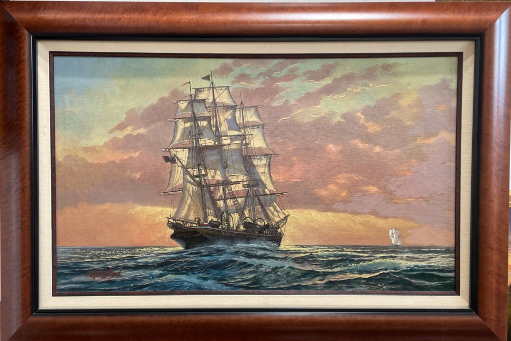 A tribute to the spirit of exploration and literary legacy—this masterful seascape channels the boldness of Conrad’s voyages through wind, wave, and light. With full sails unfurled and a horizon that beckons, Holland’s brushwork evokes both motion and memory. Signed and framed, ready to anchor your collection.