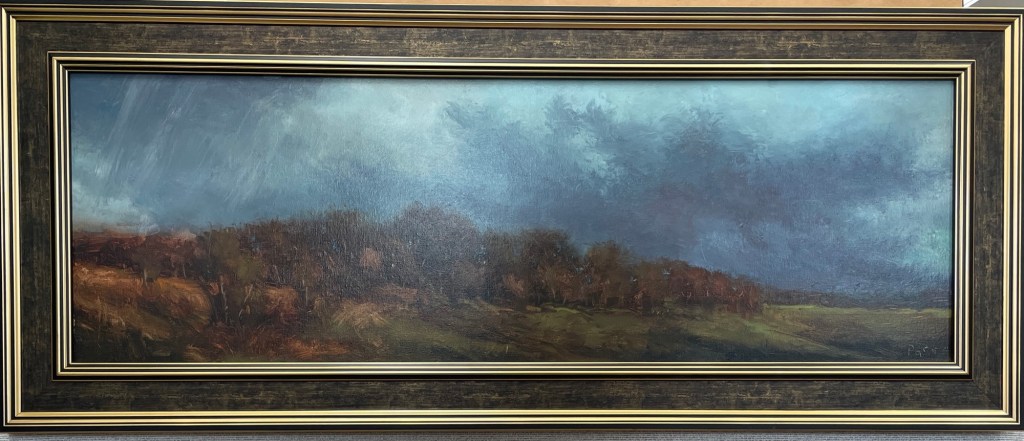 This 12” x 36” original oil on canvas by Brian Parr captures the quiet poetry of the landscape through the Tonalist tradition. With soft transitions of light and atmosphere, it evokes a sense of mystery and calm — a timeless piece for collectors who appreciate depth, mood, and the beauty of subtlety.