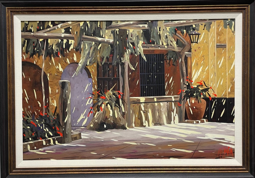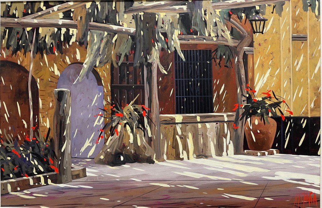 Sunlight spills through the trellis, casting dappled shadows across terracotta pots and golden walls. Aymara’s brushwork captures the hush of a quiet courtyard—where time slows, and every shadow tells a story.