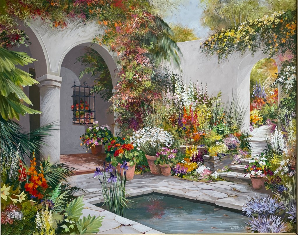 This 24” x 30” original oil on canvas by Leslie Wainwright captures the warmth of a courtyard bathed in light, where flowers spill over in radiant color and calm waters reflect the beauty of nature. A timeless piece that brings serenity indoors. 🌿🎨