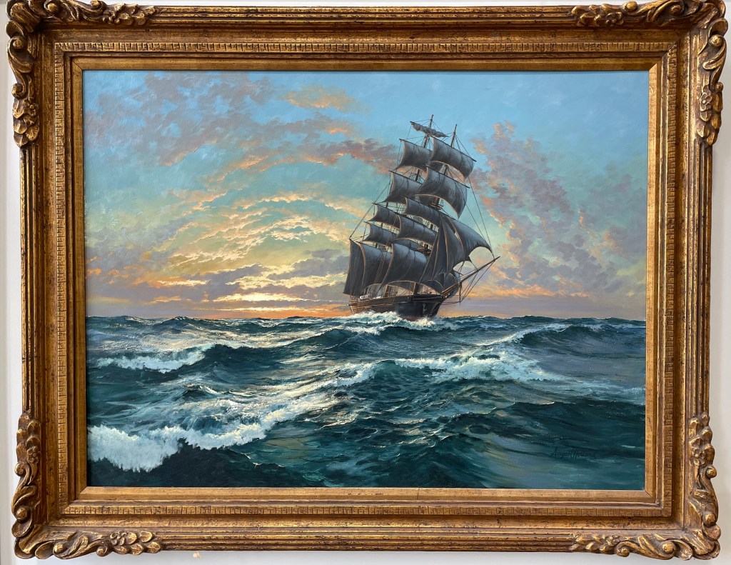 This 30” x 40” original oil painting by August Holland ASMA captures the timeless beauty of the sea—majestic waves, glowing skies, and a proud sailing ship heading into the horizon. A stunning work of maritime art for collectors who love nautical history and seascapes. 🌊⛵️🌅