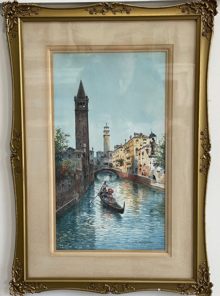 A timeless glimpse into Venice’s quiet elegance, Gavignin’s watercolor captures the golden hush of a gondola ride beneath historic facades and bell towers. With delicate washes and architectural precision, this piece evokes both romance and nostalgia—perfect for collectors drawn to European cityscapes and masterful detail.