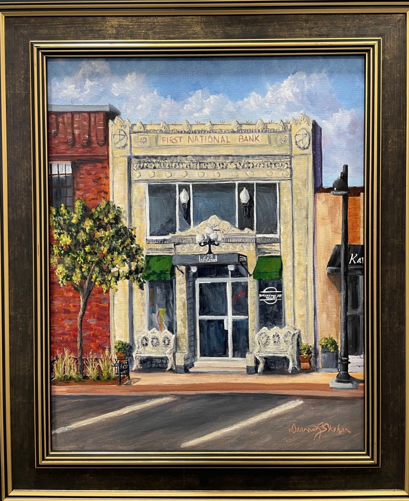This beautifully detailed work captures the timeless architecture and small-town charm of a historic bank building. From the ornate façade to the vibrant streetscape, Skokan’s brushwork brings warmth, history, and community spirit to life on canvas.