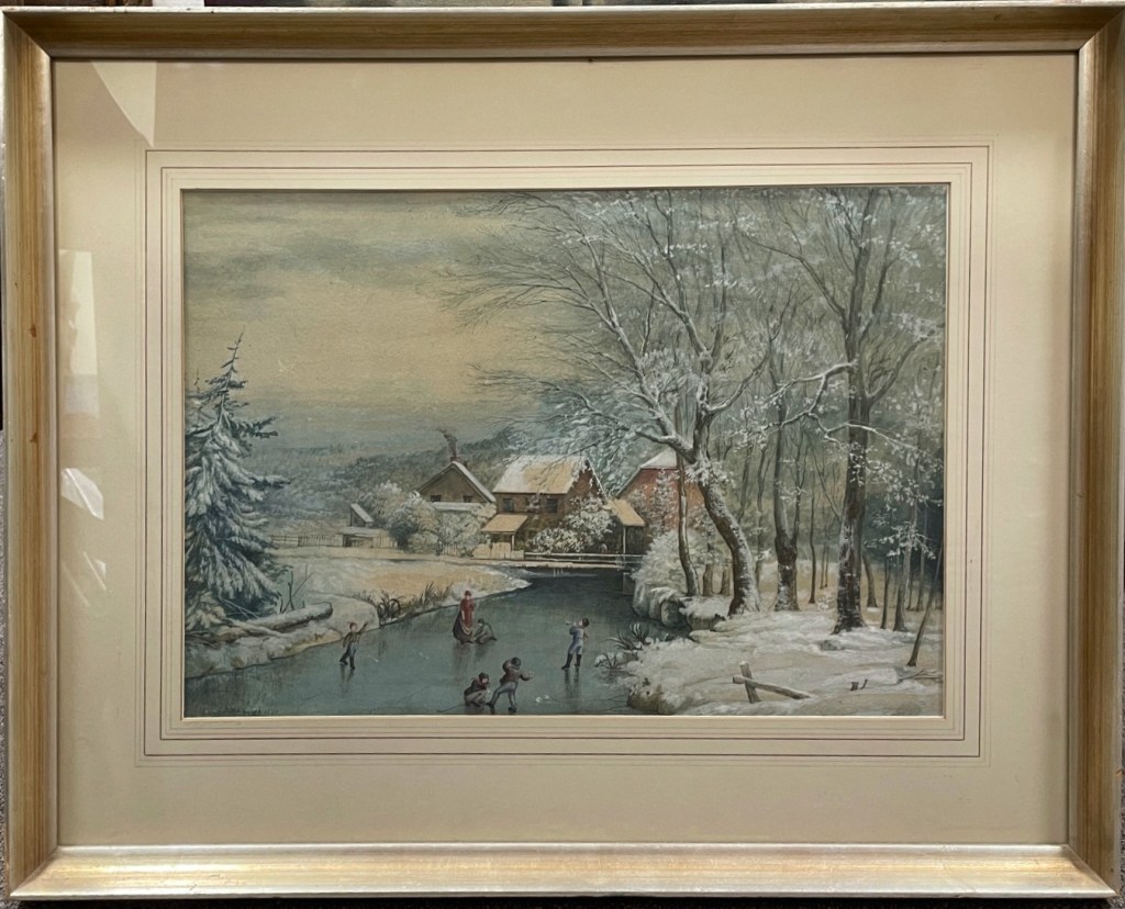 This rare 19th-century watercolor by Sala Bosworth captures a timeless winter scene of families and children skating along a frozen canal. Bosworth, one of Ohio’s earliest professional artists, was known for his detailed landscapes and ability to blend natural beauty with everyday life.