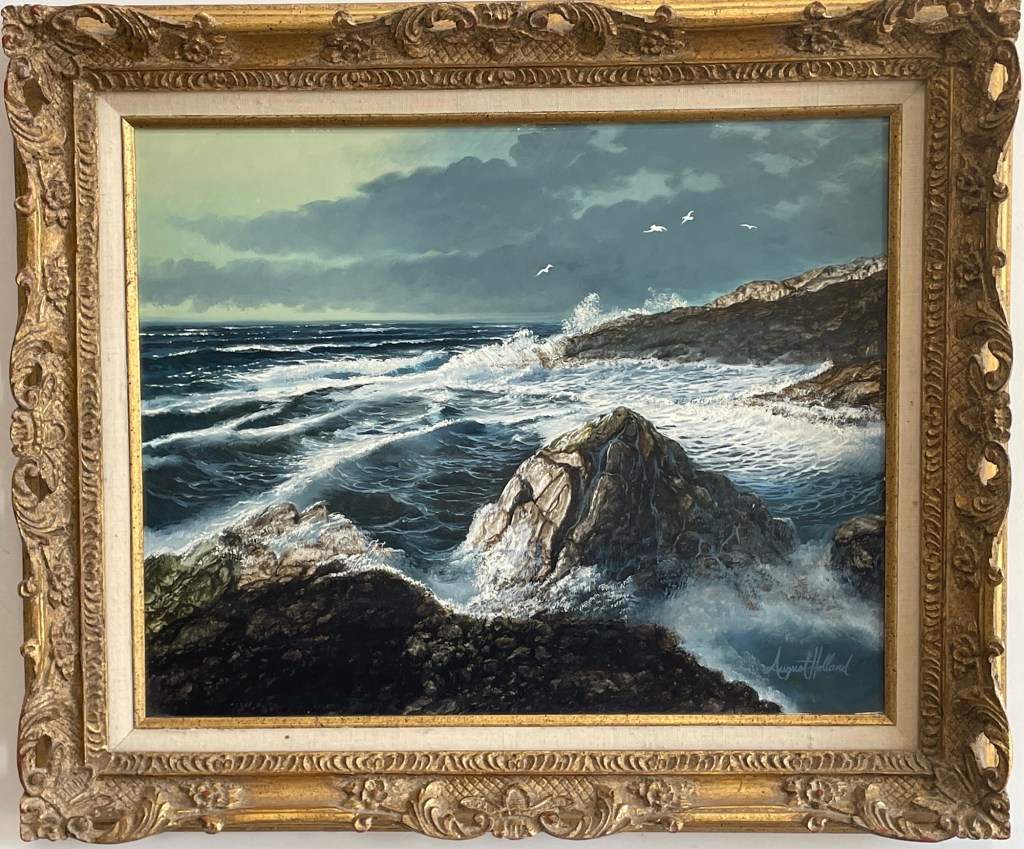 A rare and dramatic seascape from August Holland, capturing the raw force of nature in motion. Waves crash against jagged cliffs beneath a storm-laden sky, while white birds soar above the chaos—symbols of resilience and grace. Holland’s brushwork evokes both turbulence and tranquility, making this piece a striking addition to any collection.