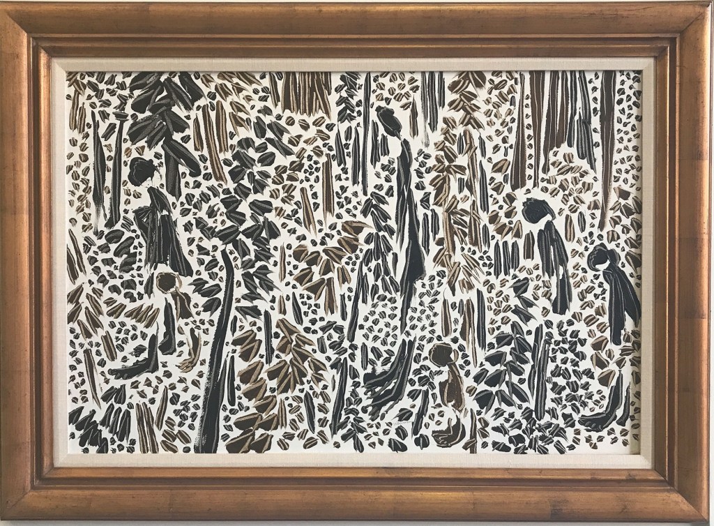 A forest of forms and memory—Six Figures in the Woods blurs the line between human presence and natural rhythm. Weinstein’s earthy palette and elongated figures evoke a quiet communion with the landscape, where identity dissolves into texture and shadow.