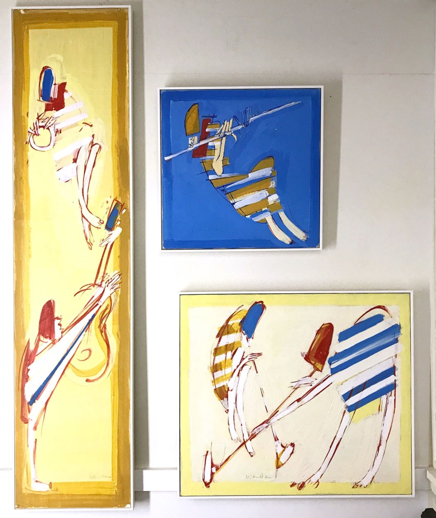Three panels, one pulse—Weinstein’s triptych channels movement, emotion, and rhythm through stylized figures and bold color. Each canvas stands alone in its gesture, yet together they form a visual cadence that dances across the wall.