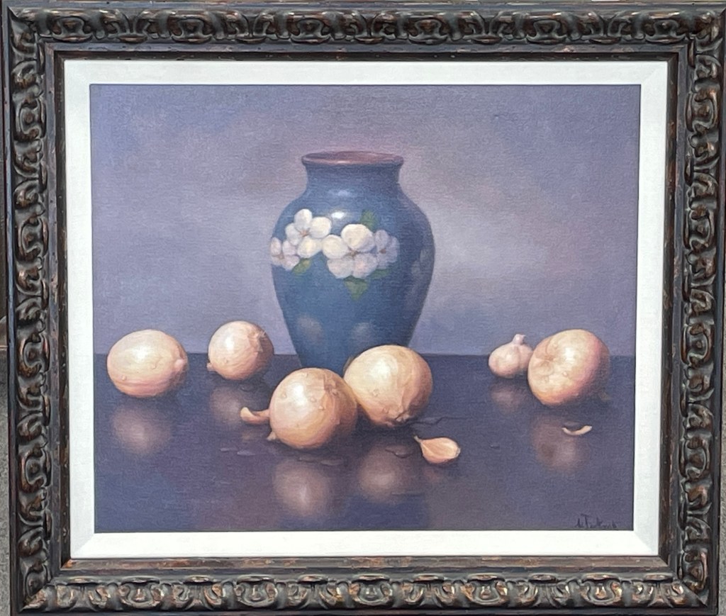 Introducing Five Onions, some Garlic, and a Blue Vase — an original 20” x 24” oil painting by Al Jackson.