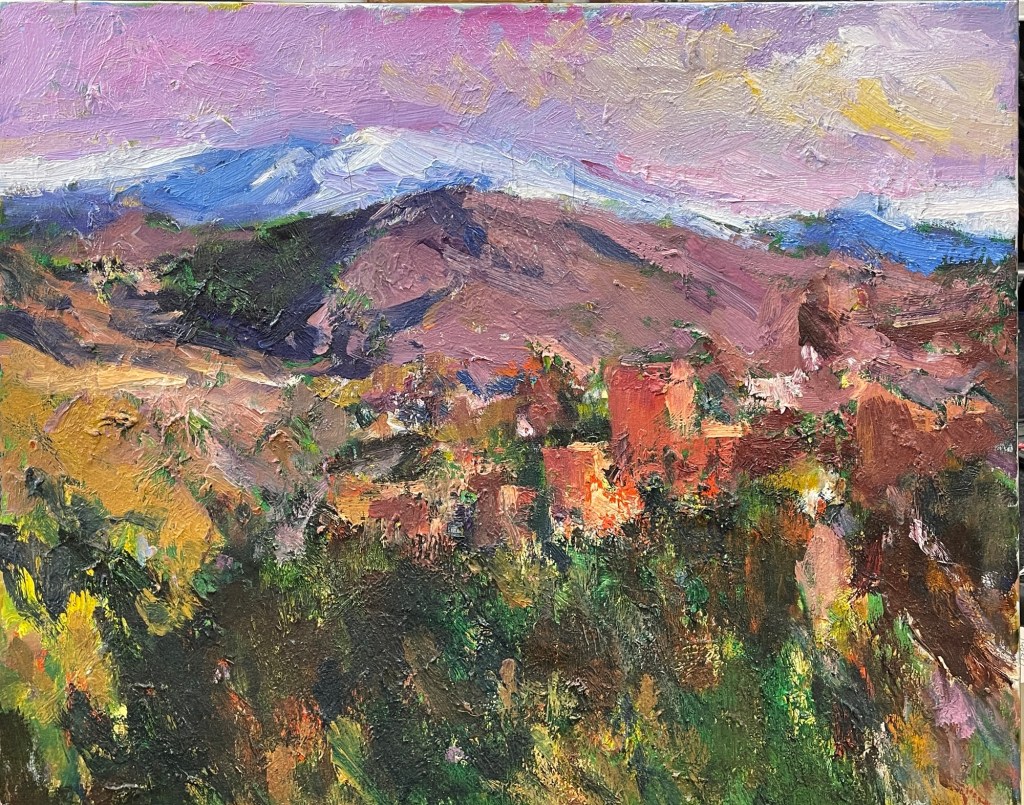 A symphony of sunset tones and textured brushwork—Granada captures the soul of a hillside village bathed in twilight. From the snow-kissed peaks to the golden vegetation below, this piece evokes warmth, nostalgia, and the quiet drama of place.
