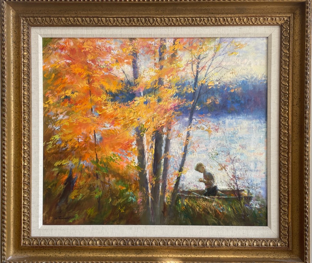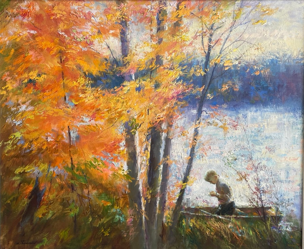 This original oil painting beautifully captures the golden glow of fall, with warm leaves framing a quiet lakeside moment. A stunning 20” x 24” piece that embodies Thompson’s gift for light, color, and atmosphere.
