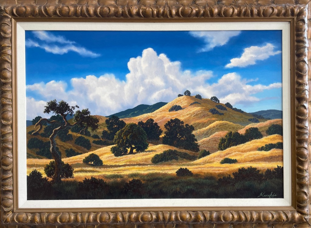 Golden hills roll beneath a sky of billowing light, where a lone twisted tree anchors the foreground like a sentinel of memory. Kecskes Jr. captures the quiet drama of California’s interior—sunlit grasses, shadowed slopes, and the timeless hush between cloud and land. This piece invites reflection, nostalgia, and a sense of place that feels both intimate and expansive.