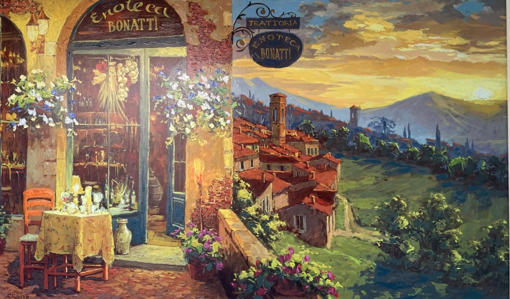 Step into the golden hour of a romantic Italian escape. Sunset Blaze captures the warmth of twilight as it spills across hillside rooftops and quiet trattorias, inviting viewers into a world of timeless charm. Shvaiko’s signature palette—rich ochres, deep crimsons, and soft amber light—evokes both nostalgia and serenity, making this piece a standout for collectors of European-inspired landscapes.
