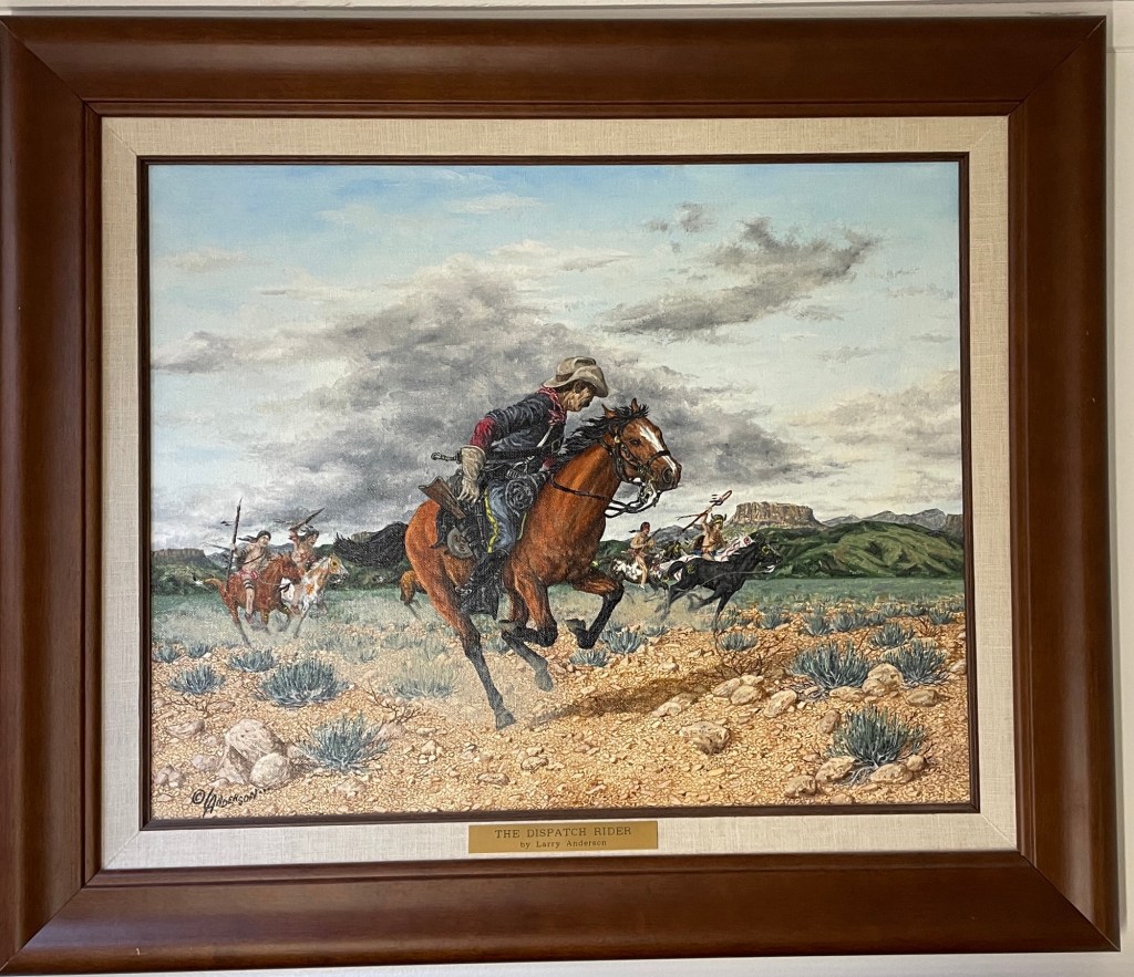 A moment of high-stakes urgency unfolds in The Dispatch Rider, as a lone cowboy races across rugged terrain, pursued by Native warriors through dust and shadow. Anderson’s brushwork captures the tension and motion of the chase, set against a backdrop of desert cliffs and storm-stirred skies. This piece channels the mythos of the American West—its danger, grit, and raw beauty.