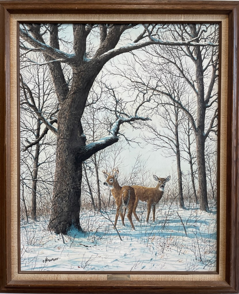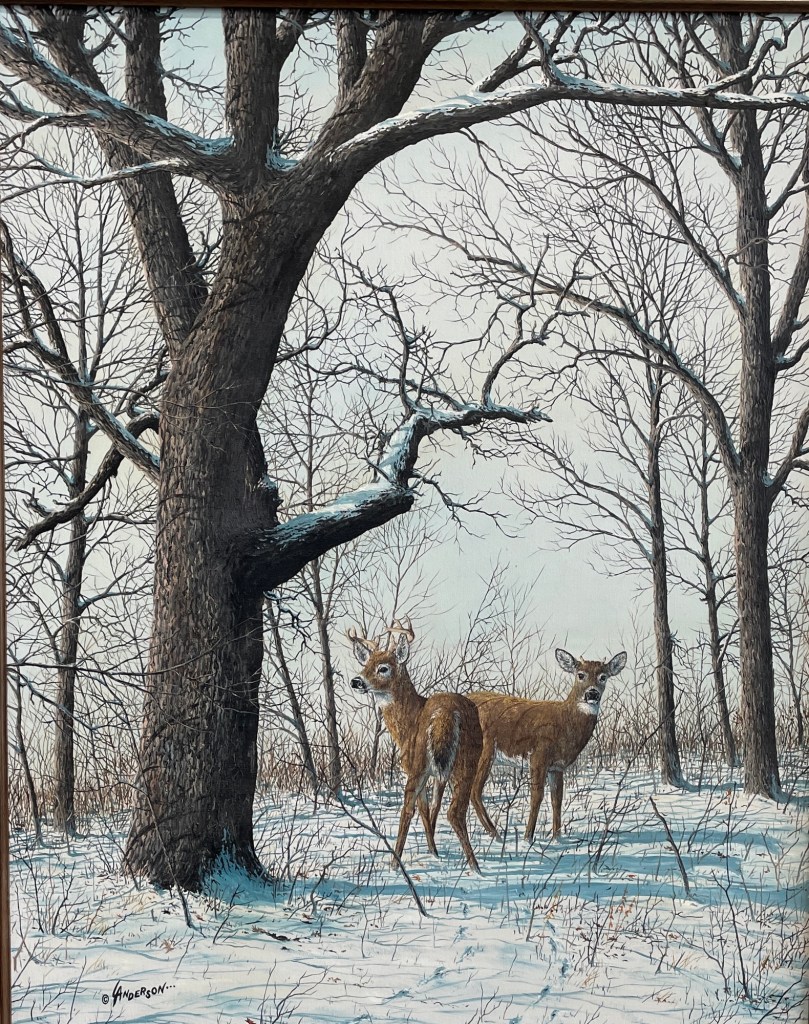 A quiet hush falls over the land—bare trees, soft snow, and two deer pausing in the stillness of an Iowa winter. Anderson’s brushwork captures not just the scene, but the feeling: solitude, reverence, and the quiet dignity of nature.