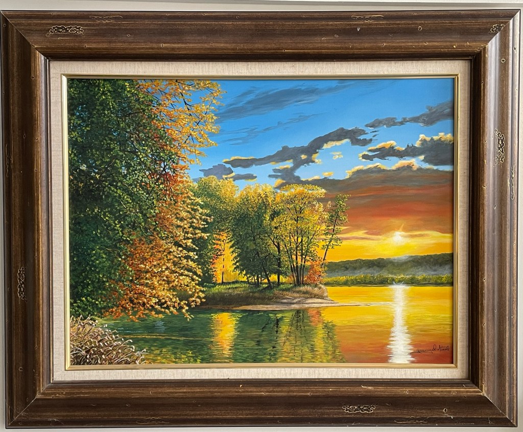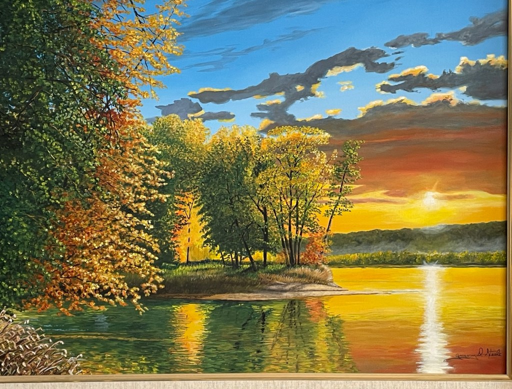 A quiet island bathed in autumn light—Greg Steele’s River Island captures the hush between seasons with masterful brushwork and tonal depth. The golden hour glow, mirrored on still waters, invites reflection and reverence.