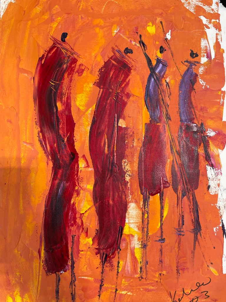 A dance of color and connection—Kalweo’s Couples II pulses with energy, intimacy, and contrast. Sweeping strokes in red and violet collide with golden light, capturing the rhythm of partnership: fluid, fierce, and deeply felt.