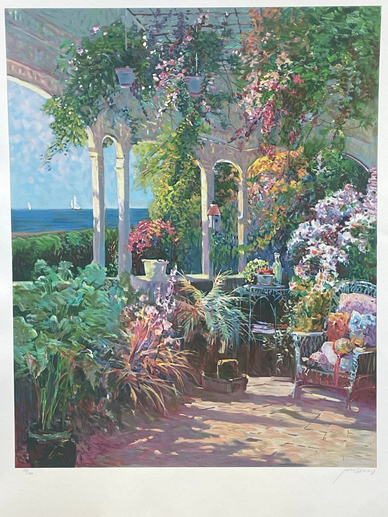A garden bathed in golden light, where ocean breezes meet blooming vines. Ming Feng’s masterful serigraph captures the serenity of a summer afternoon—tea poured, sailboats drifting, and time suspended beneath a floral pergola.