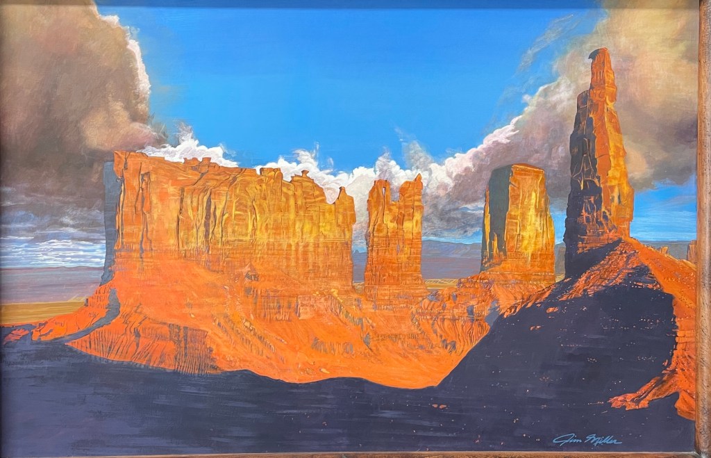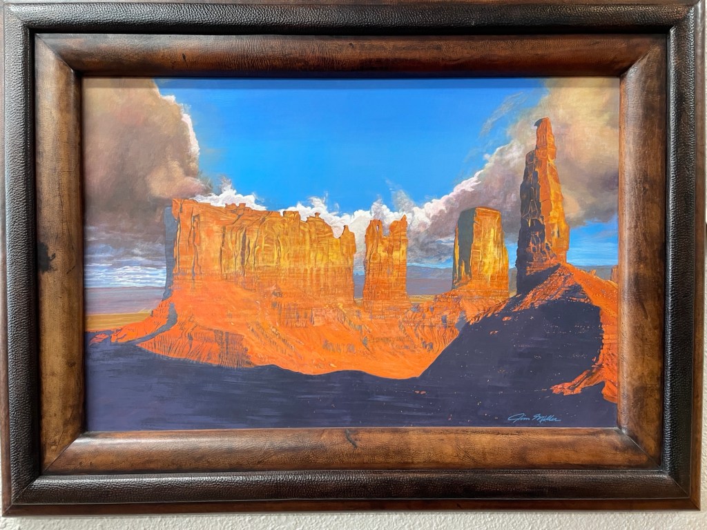 This 24” x 36” oil on canvas by Jim Miller captures the spirit of the American West with atmospheric depth and emotional resonance. Miller’s work is known for its ability to transport viewers—his brushwork evokes the scent of sagebrush, the glow of desert light, and the quiet strength of the land.
