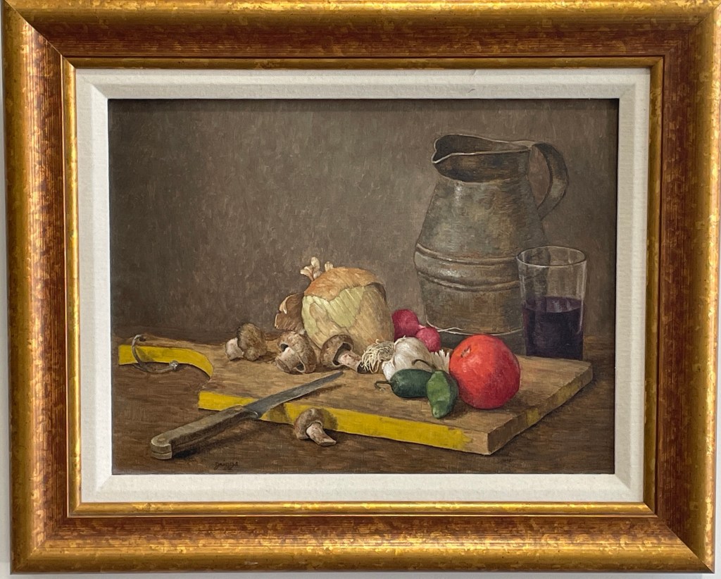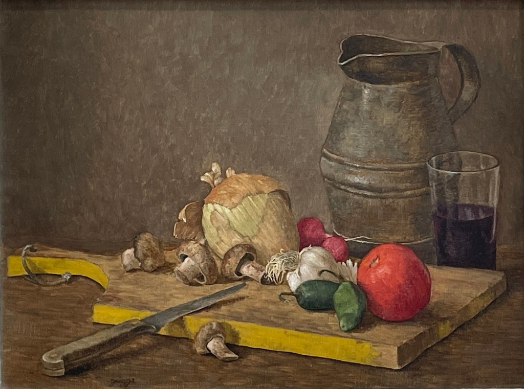 A master of psychological still life, Dan Griggs brings quiet drama to the everyday in this richly detailed composition. Cutting Board captures a moment of culinary pause—mushrooms, radishes, tomato, and cabbage gathered on a wooden board, flanked by a gleaming metal pitcher and a glass of wine. The textures are rendered with exquisite realism, yet the mood hints at something deeper: harmony, mystery, and the quiet tension of preparation.