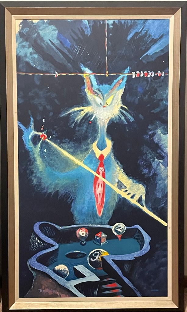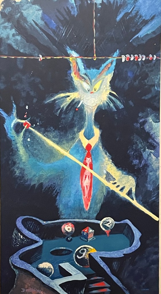 A noir-ish nod by Dr. Seuss meets downtown grit—this long-limbed feline lines up a shot in a world where pool balls float, cubes roll, and nothing plays by the rules. Blue fur, red tie, yellow eyes: the mood is mischief, the vibe is surreal.