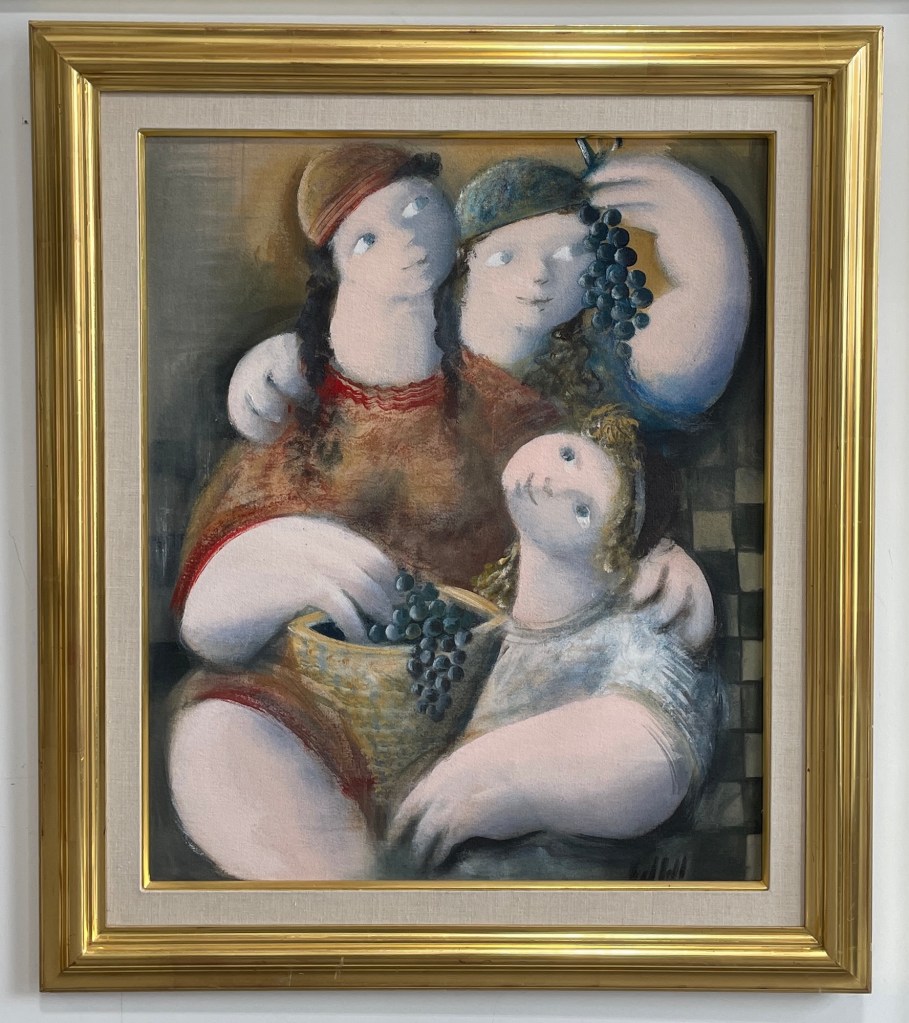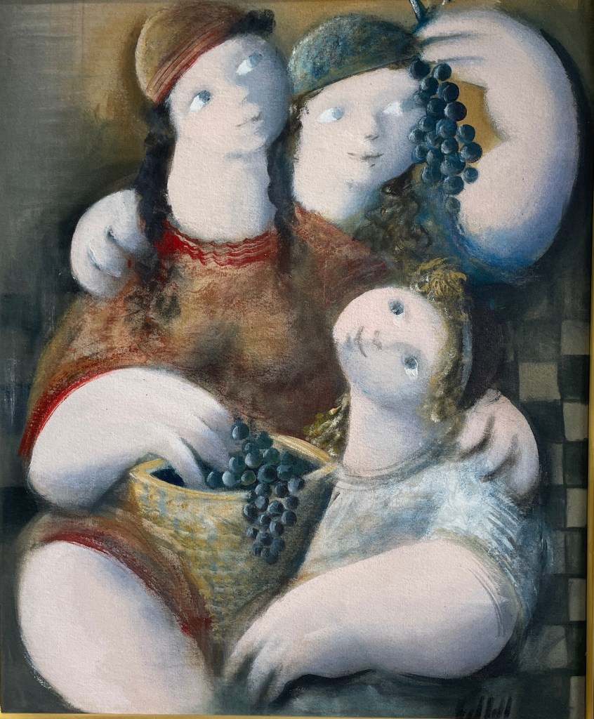 A tender moment of harvest rendered in soft, rounded forms—Collell’s figures seem to float in a dreamlike rhythm, cradling grapes as symbols of abundance and connection.