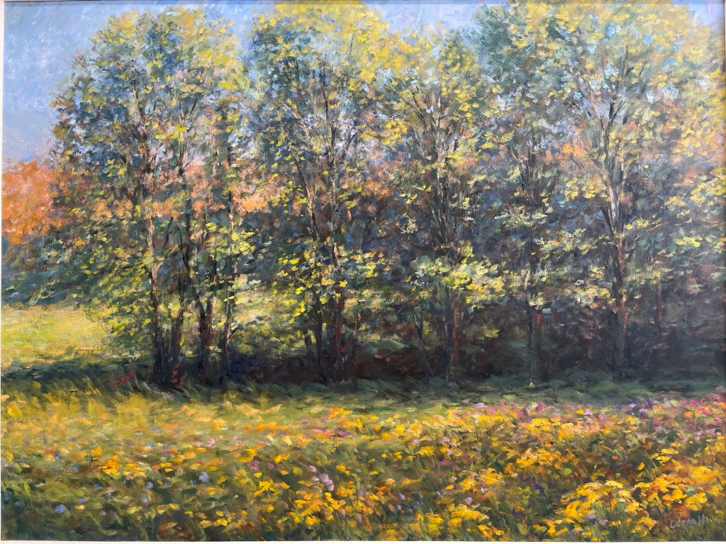 Sunlight filters through golden leaves, casting long shadows across a field of wildflowers. In October Trees, Carroll captures the quiet drama of seasonal change with impressionistic brushwork and a palette that hums with warmth.