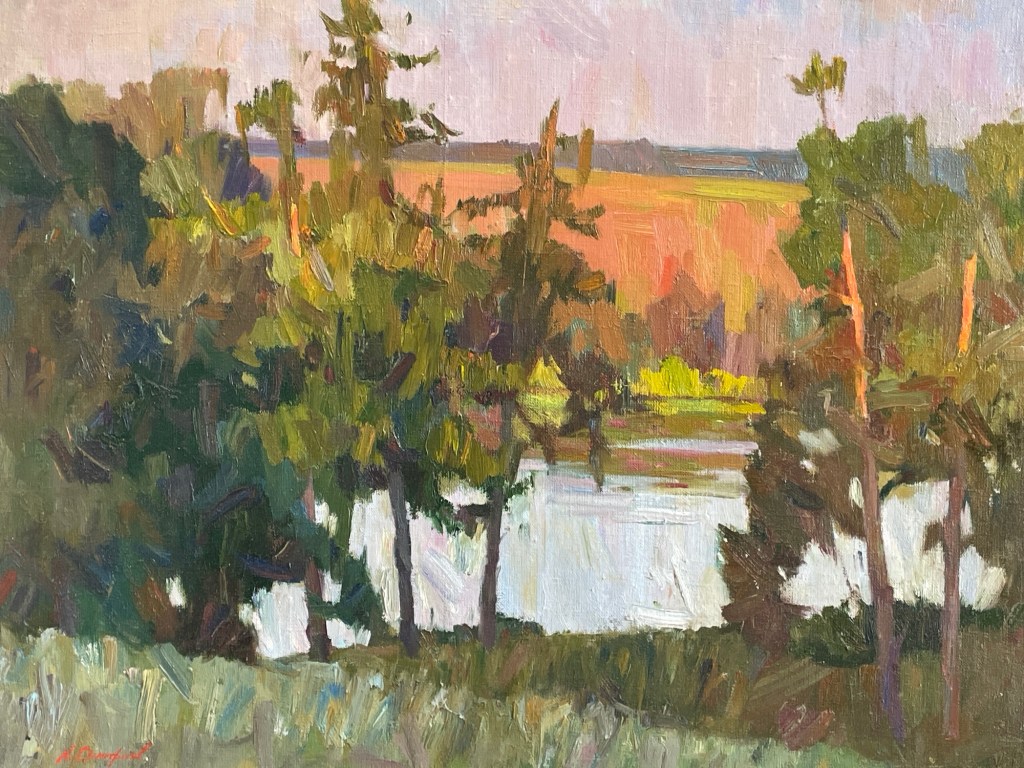 A tranquil study in light and reflection—Kharkov by Ukrainian artist Alexy Dmitriev captures the quiet poetry of nature at dusk. This 22” x 28” oil painting blends impressionistic brushwork with a warm, harmonious palette, evoking the serenity of water, trees, and fading sky.
