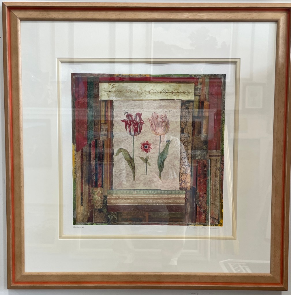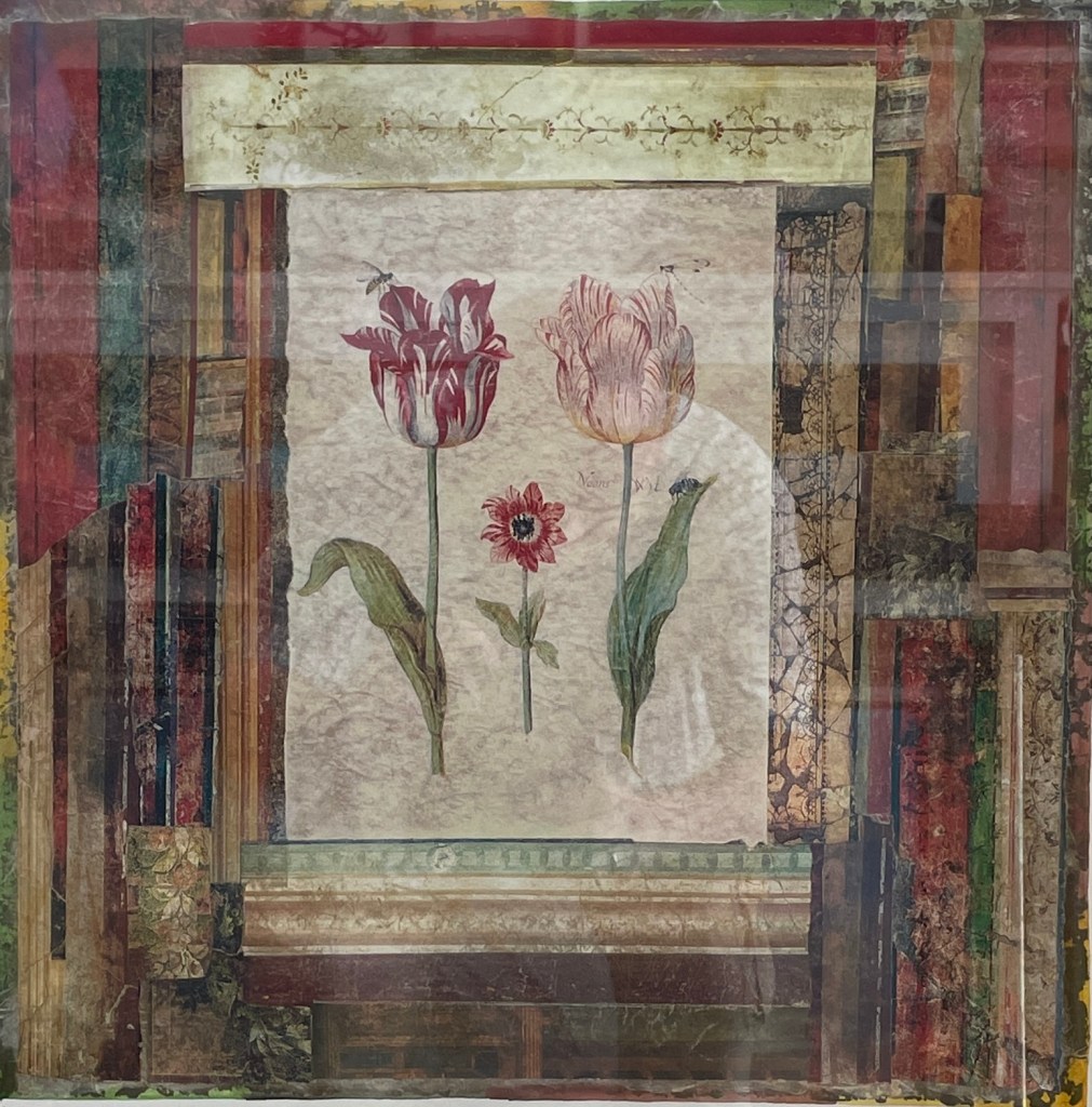 A botanical reverie in bloom—two tulips and a crimson starburst rise through textured borders of gold, green, and rust. Danielle Desplan’s layered composition evokes spring’s quiet drama, where nature meets abstraction in a frame of earthy elegance.