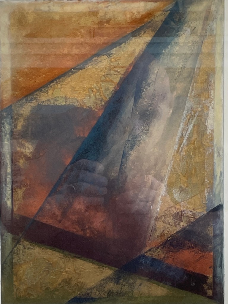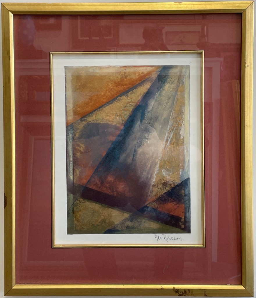 A dynamic interplay of geometric forms and layered color fields—Roberts invites the viewer to navigate tension and harmony through shifting planes of blue, ochre, and sienna. Framed in gold with maroon matting to echo the painting’s tonal depth.