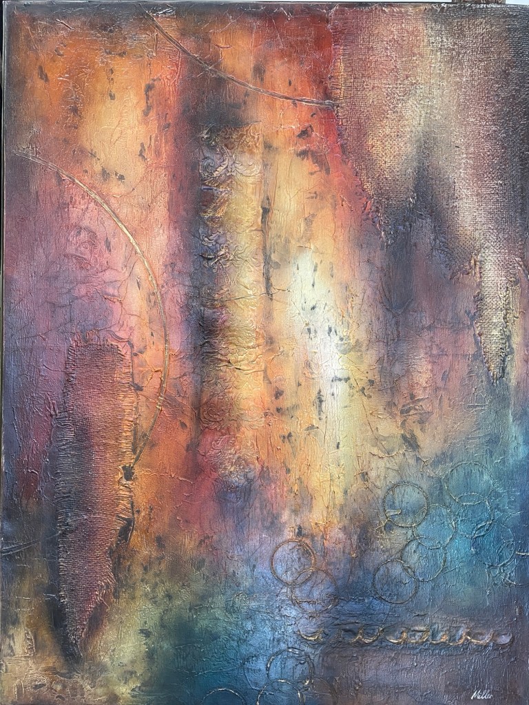 A study in motion and mood—Abstract #630 pulses with layered energy. Circular forms drift through a textured field of warm ochres, cool blues, and shadowed purples, suggesting both cosmic rhythm and emotional terrain. Miller’s tactile surface work and intuitive color shifts invite reflection, not resolution.