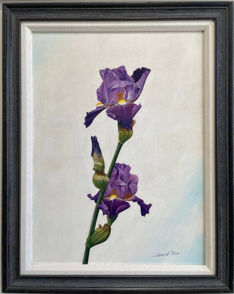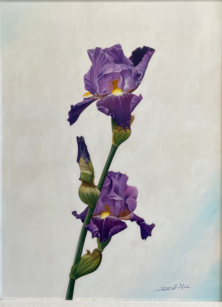 A luminous study in botanical elegance—Steele captures the iris in full bloom, its violet petals unfolding against a soft sky. The composition balances precision and emotion, inviting quiet reflection.