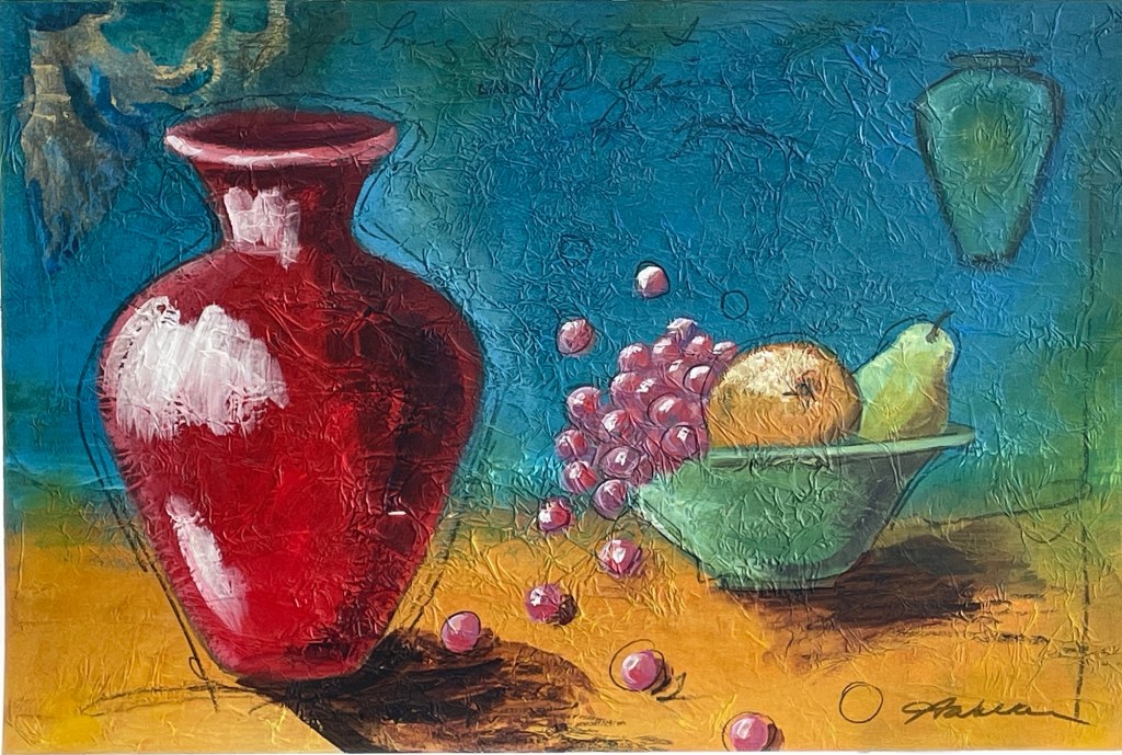 A vibrant interplay of color and texture—this dynamic still life draws the eye with its glossy red vase, cascading grapes, and painterly backdrop. The layered composition and bold palette evoke both abundance and movement, making it a standout piece for collectors who appreciate expressive detail.