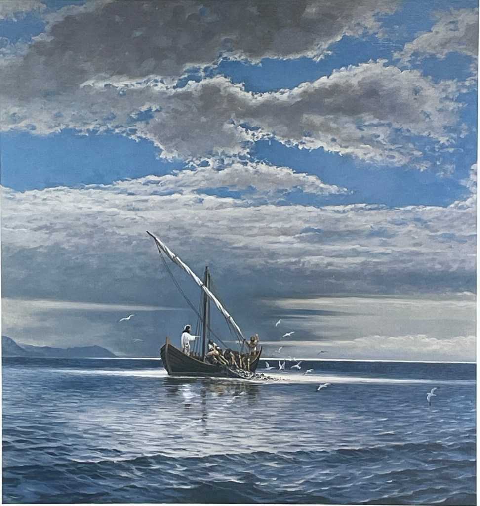 A serene moment rendered with spiritual depth—this signed lithograph invites reflection and calm. Holland’s mastery of light and composition evokes themes of faith, community, and purpose. A beautiful companion to Peace Be Still, or a standalone treasure for collectors of maritime and biblical art.