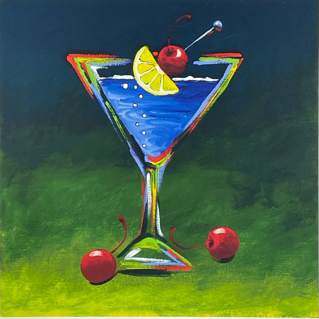 A cocktail of color and charisma—this vibrant blue martini pops against a moody backdrop, garnished with cherries, citrus, and a splash of neon linework. Powell’s playful precision turns a classic drink into a visual celebration.