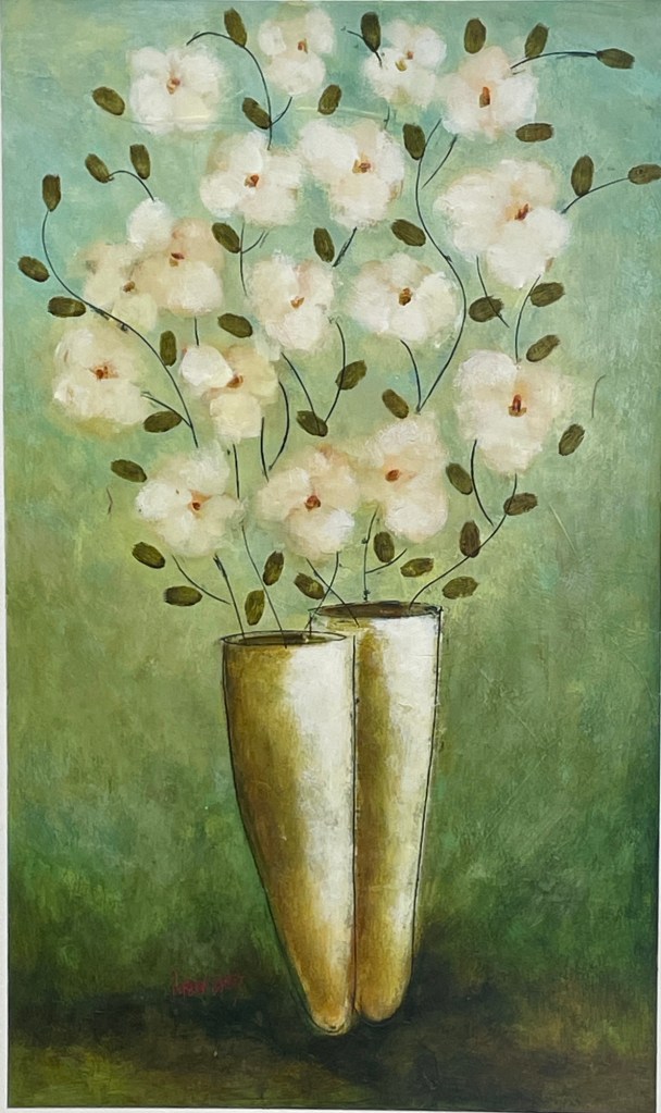 Twin vessels rise like sentinels, cradling delicate white blooms that drift between stillness and motion. Loren Grey’s vertical composition invites quiet contemplation—metallic textures meet soft petals, set against a serene wash of green and blue. A study in balance, elegance, and the poetry of form.